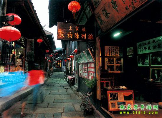 拾級而上,山路一般的陡峭。從碼頭開始綿亙而上的石階,那是一條長達(dá)五里貫穿古鎮(zhèn)的青石板路,它沒有名字,于是人們就直接管它叫五里長街。踏上古街,似乎踩在被悠長歲月遺落的碎片上面。不知不覺走到掛有“土家觀瀑吊腳樓”牌匾的民俗博物館前,從手搖腳踏的棉花機(jī)、閹豬鳴號的羊角到世代相傳的雕花牙床,近百件散發(fā)著鄉(xiāng)土氣息的民間用具,展示著土家族古老豐富的歷史??醋o(hù)人說,這是一位土家族年輕人爬山涉水收集來的,靜靜地訴說著這個小村古老的過去。這棟三層的小樓,一半落在河岸上,另一半?yún)s是由水泥柱支撐著,水泥柱直插河底,任水流日日夜夜地沖刷,小小的吊腳樓仍穩(wěn)穩(wěn)當(dāng)當(dāng)站在那里,任憑時間的流逝。好聰明的土家人,巧借一片水面,竟建起了如此妖嬈的住房。