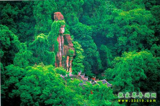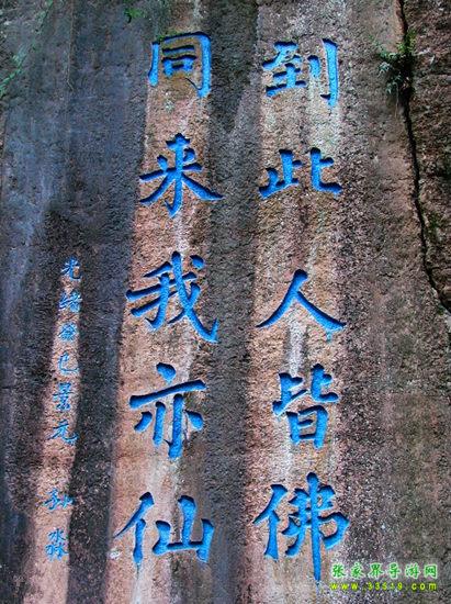 不二門內(nèi)由石灰?guī)r風(fēng)化形成的一尊巨大石佛,聳立于萬綠叢中,高六丈,青冠白面,頭頂白云,腳踏碧水,人們以其形神稱為“觀音巖”。《永順縣志》稱“觀音巖素有‘湘景名峰第一巖’之稱”。觀音巖下,聳立著一組瑰麗多姿、古色古香的殿閣建筑群,這就是“嵩山堂”,包括三觀殿、玉皇閣和禪房客舍,工藝精巧,玲瓏別致。特別是正殿后的地藏庵,與老司城明代建筑祖師殿結(jié)構(gòu)相似,背倚石壁,右通八陣圖,左達(dá)熱水坑,周圍怪石森列,古木參天。觀音巖北部山上是天造地設(shè)的“八陣圖”,有的如排戟,有的似春筍;有的像古佛,有的若走獸。八陣圖之奇,不僅在于它林立的怪石,最主要的是在于由龜裂紋石板鋪成的時(shí)上時(shí)下時(shí)隱時(shí)現(xiàn)的彎彎小徑——或穿過地下幽深的石洞,或延展于密林雜草叢中,或環(huán)繞于奇峰怪石之間,使八陣圖的東、南、西、北四門相通,復(fù)雜繁多的石徑互相連接形成網(wǎng)絡(luò),人們有時(shí)難以找到出路。也許,這就是八陣圖命名的緣由。不二門內(nèi)兩側(cè)石壁開闊如屏,歷代文人墨客或贊山水之幽絕,或抒心胸之豪情,雕鑿了種種摩崖石刻。據(jù)《永順縣志》記載,不二門石刻有神秀獨(dú)鐘、吾道南來、白云門開、砥柱中流、眼前南海、百寶勝光、別開生面、別有天地等100多處。歷經(jīng)風(fēng)雨滄桑之后,現(xiàn)僅存鬼斧神工、勝境無雙、滌盡塵氛、瞻奇仰異、海上飛來等數(shù)十處。清代名士白介庵所作《松徑留云》、《古洞仙蹤》、《層閣聳翠》、《玉嶂屏環(huán)》、《澄潭月影》等觀音巖八景詩尚凸現(xiàn)在石壁之上。其中《石門天鑿》一詩完整無缺:“法門高聳五云偎,鬼斧神工妙化裁。鞭石無痕還著相,振山有鐸不須錘。地沾花雨千歧坦,道接薪傳一線開。莫道終南稱捷徑,巨靈神辟小蓬萊。”清代庚辰年間的探花景元,曾在石壁上題刻“到此人皆佛,同來我亦仙”。他還以一筆揮成的“山青海岸”疊字如圖似的符合成一個(gè)“岸”字鑿刻在摩崖之上,堪稱罕世之作。石壁上近年來還鐫刻了偉人毛澤東的詩詞和儒將蕭克、畫家黃永玉等巨擘的題字,游人置身其間,飽享山水美景、名勝古跡與文化藝術(shù)的熏陶。