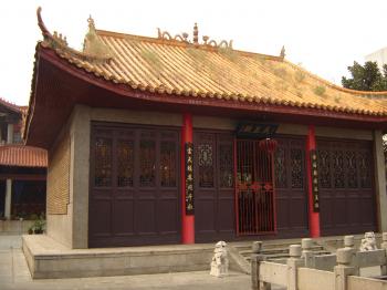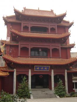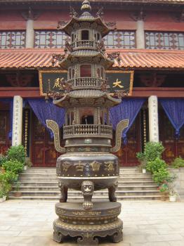 主佛靠背,是千手觀音,雕塑精美, 全身耀金。 相傳塑這尊觀音共花去白銀8000余兩。觀音前有一副對(duì)聯(lián):
