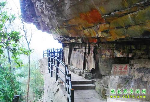 羅漢迎賓上方西南側(cè)石壁上,有一處空間高約3米、深1-3米、長(zhǎng)20多米的巖屋,是絕妙的觀景臺(tái)。登臺(tái)南眺,遠(yuǎn)山如黛。近處左上側(cè)有石峰數(shù)座,倚天而列。北邊一峰類人,西向側(cè)面而立,似頭著兜鍪,身披甲胄,左臂下垂,傲視藍(lán)天,游人戲稱“獨(dú)臂武將”。巖屋下20米,一峰如葫蘆豎立,高約30米,直徑約10米,底、肚、頸、口俱全,附生的草木如花紋圖飾,一塊重達(dá)數(shù)噸的石板蓋于口上,稱”仙丹葫蘆“。對(duì)面一組山峰形如駱駝踽踽東行。駱駝前方是一山坡,有草無樹,夏日青似草原,秋天黃如大漠,駱駝?wù)蚰抢镒呷ァ?/p>