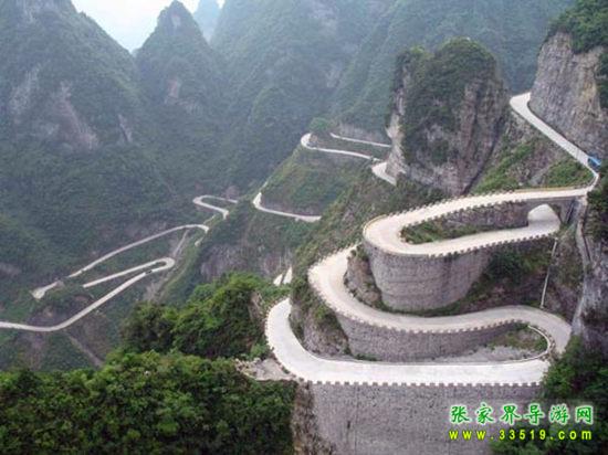 極具險(xiǎn)絕奇觀的天門山盤山公路——“通天大道”則是天門山的另一壯景。通天大道態(tài)勢(shì)險(xiǎn)絕,蕩氣回腸,更以蜿蜒迂回穿行于山體絕壁之天險(xiǎn)而“堪稱天下第一公路奇觀”。它全長(zhǎng)10.77公里 ,從標(biāo)志門直達(dá)天門洞腳下,海拔從200米急劇提升至1300米,共有九十九個(gè)彎,大道兩側(cè)絕壁千仞,空谷幽深,180度的急彎此消而彼長(zhǎng),層層疊起,中國(guó)書法協(xié)會(huì)常務(wù)副會(huì)長(zhǎng) 沈鵬 先生走過(guò)通天大道后欣然為其題字“曲道通天”,字體遒勁挺拔,與通天大道的奇絕天下相融為一體。