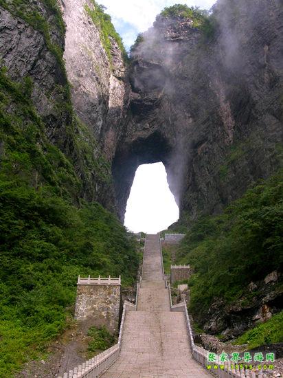 天門洞位于天門山山體的中上部,是世界上最高海拔的天然穿山溶洞,海拔1300米 ,其高131.5米,寬57米 ,深60米。它南北對(duì)開(kāi)于千尋素壁之上,扶搖而通天,似明鏡似天門鑲嵌于蔚蔚天幕之上,終年吞云吐霧,蔚為壯觀中更加神秘莫測(cè)。“天門洞開(kāi)云氣通,江東峨眉皆下風(fēng)”元朝的著名詩(shī)人張兌曾這樣贊嘆,磅礴的氣勢(shì)由此可見(jiàn)。1700多年來(lái),這一道奇絕天下的勝景吸引著無(wú)數(shù)的探訪者趨之若騖。特別是在1999年,世界特技飛行大師架機(jī)穿越天門洞,在全球引發(fā)了轟動(dòng)效應(yīng),收看現(xiàn)場(chǎng)直播的觀眾達(dá)到8億之多。