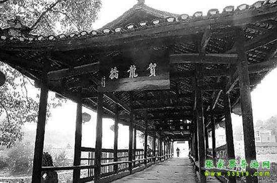 賀龍橋原稱“永安橋”。飛架于賀龍故居右側(cè)玉泉河上,是一座石墩、木粱、騎廊的風(fēng)花橋。東西長40米、寬7米、高8米。龍爪翹檐,中聳堡亭,8尊石獅,分置橋頭及石墩之上,造型渾厚古樸,富有民族特色。此橋原是溝通桑植內(nèi)外半縣的必經(jīng)之道,是上川鄂下津澧的要津,也是當(dāng)年鹽局奪槍、桑植起義的發(fā)端處。系賀龍?jiān)娓纲R廷宰首倡捐資修建,幾番修而復(fù)圮。至1916年,終由賀龍父親賀仕道襄修告竣。1929年冬,桑植“剿共”司令陳策勛,謂以破“賀氏風(fēng)水”,令毀此橋。解放后,桑植縣人民政府于1952年冬按原樣復(fù)修,命名“賀龍橋”。“文化大革命”動(dòng)亂中,林彪、“四人幫”誣陷賀龍,指使“紅衛(wèi)兵”毀橋,群眾奮起護(hù)衛(wèi),才幸免劫難。1983年5月,賀帥女兒賀曉明應(yīng)縣政府請(qǐng)求,得全國書法家協(xié)會(huì)秘書長謝德萍書匾“賀龍橋”,高懸橋之東西首,永志紀(jì)念。1978年,賀龍故居及其生平業(yè)績陳列室、賀龍橋,列為省級(jí)重點(diǎn)文物保護(hù)單位。凡到賀龍故居、賀龍紀(jì)念館的游客這是必經(jīng)之地。