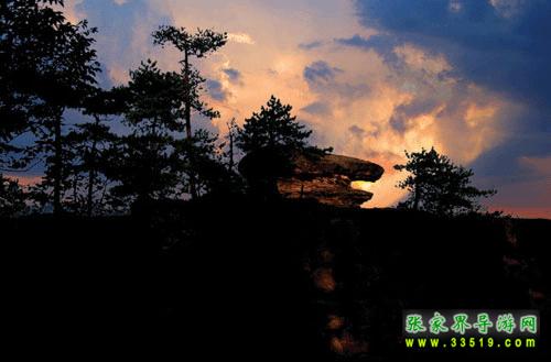 從黃石寨頂西邊下山時(shí),后卡門邊一頂部呈平展臺面的石峰上,一只長約5米的石龜頭部向前,作爬行狀。晴天,龜巖呈金黃色,故稱金龜。氣候的變化又可使其呈現(xiàn)各種不同顏色和形狀,故它又有“霧海金龜”、“金龜探海”、“落日金龜”等幾個(gè)別名。