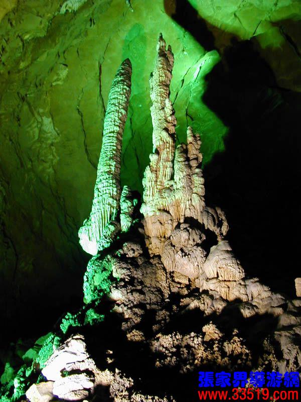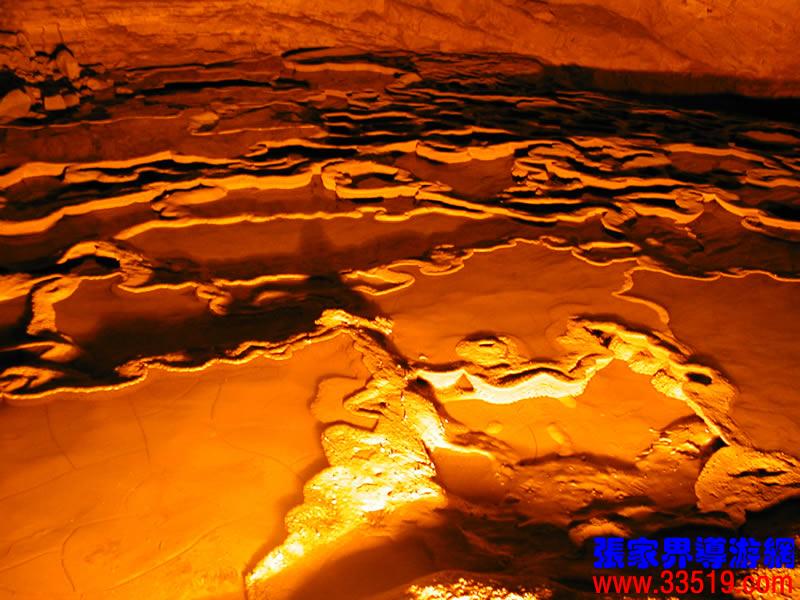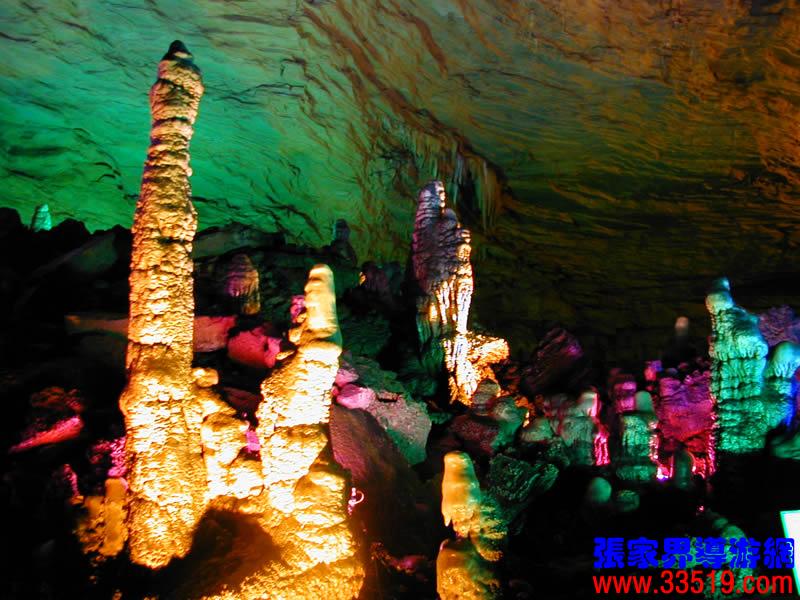(龍宮)龍宮是黃龍洞十三個大廳中最大的一個,也是景色最美的景點之一,底面積15000平方米,平均高40米,兩千余根石筍拔地而起,千姿百態(tài),異彩紛呈,或如飛禽走獸,或如宮廷珍藏,有的像巍巍雪松,有的像火箭升空。龍宮后園有金銀兩座花池,清水常溢,花簇盛開。宮頂鐘乳柳垂簾掛,四周壁畫栩栩如生。溶解著各色各樣的礦物質的水,從巖層中滲透出來,滴落下來。礦物質在洞頂凝固結晶成倒懸鐘乳石,從鐘乳石滴落的水又把礦物質澆疊、堆壘在洞底,而長成節(jié)節(jié)向上的石筍。大家看看這龍宮的造型,領略這磅礴的氣勢。洞內最大石筍,高12米、直徑10米的漢白玉天然石椅“龍王寶座”居高臨下,眾多石柱石筍似人似物,維妙維肖,圍著寶座朝拜山呼,幾十座珊瑚亭亭玉立,儼然一支龐大的“宮廷樂隊”。湖南著名教授羊春秋先生作《寄生草》詞對此進行描繪:“百態(tài)千姿模樣,三宮六院門巷。龍王開宴設瓊漿,猴王偷果鬧天堂,君王納寵擁羅帳。搬演了人間爭攘,匯集了天下奇觀。”