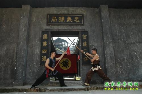 忠義鏢局,它始建于清乾隆四十二年(1777),位于洪江龍船沖,這里會(huì)館、錢莊、豪宅林立,堪稱洪江的曼哈頓。與我們在古商城看到的窨子屋不同,這是一座典型的北方四合院,前庭后院,布局嚴(yán)謹(jǐn),軸線明確,左右對稱,主次分明。前院是鏢師練功習(xí)武之地,墻壁上書有“忠”、“孝”、“禮”、“義”四字和“十八羅漢練功圖”;后院為鏢師起居和洽談生意之所,內(nèi)供奉關(guān)武大帝。忠義鏢局主要為豪商巨賈押運(yùn)銀票、貨物,看家護(hù)院,坐夜守店,也開館收徒,傳授武藝。忠義鏢局的掌門人劉大鵬,湖南長沙人,幼時(shí)即入嵩山少林寺習(xí)武,不僅精通十八般武藝,而且頭腦精明,他把鏢局開在這洪江最繁華的金融一條街,足見他的經(jīng)商意識(shí)和人面廣了?,F(xiàn)在忠義鏢局現(xiàn)場表演古代押鏢、行鏢全過程,是人們了解中國古代鏢行歷史文化的活性博物館。有興趣的朋友可以去洪江古商城親自感受一下當(dāng)時(shí)押鏢的情景吧。