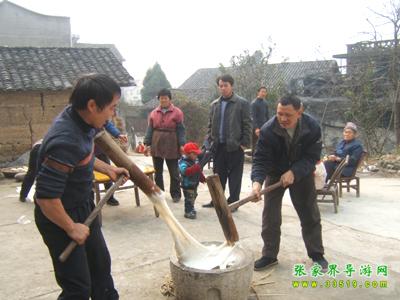 土家人民素有“二十八,打粑粑”的說法。每逢春節(jié)來臨,農(nóng)歷臘月末,家家都要打糯米糍粑,所謂打糯米糍粑,據(jù)當(dāng)?shù)剜l(xiāng)土志書記載:“系糯米飯就石槽中杵如泥,壓成團(tuán)形,形如滿月。大者直徑約尺5,尋常者約4寸許,3至8分厚不等。”打糯米糍粑是一項勞動強(qiáng)度較大的體力活,一般都是后生男子漢打,兩個人對站,先揉后打,即使冰雪天也要出一身汗。做粑粑也很講究,手粘蜂臘或茶油,先出砣,后用手或木板壓,要做得玉圓光滑,講究美觀。