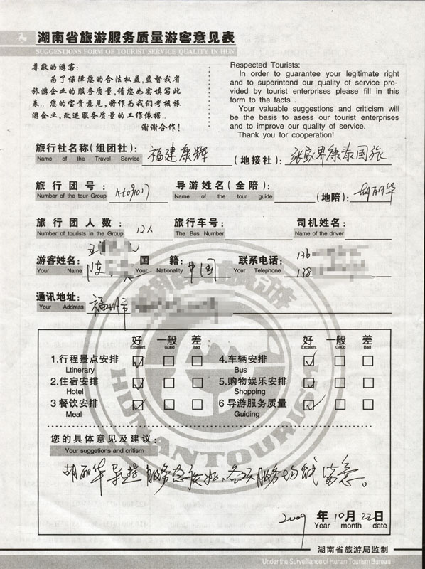 2009年10月17日福州王先生一行12人接待質量反饋單: