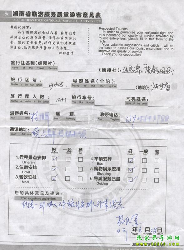 2009年6月25日安徽楊先生一行18人接待質(zhì)量反饋表: