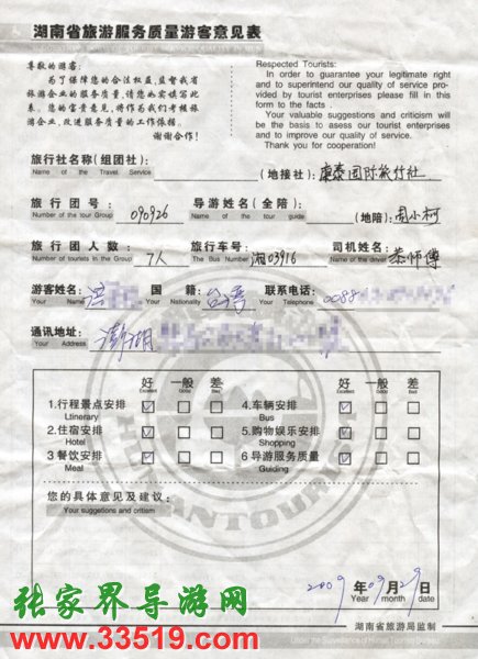9月26日臺灣李洪先生一行7人接待質量反饋單: