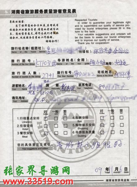2009年10月31日新加坡黃先生一行27人旅游接待質(zhì)量反饋單: