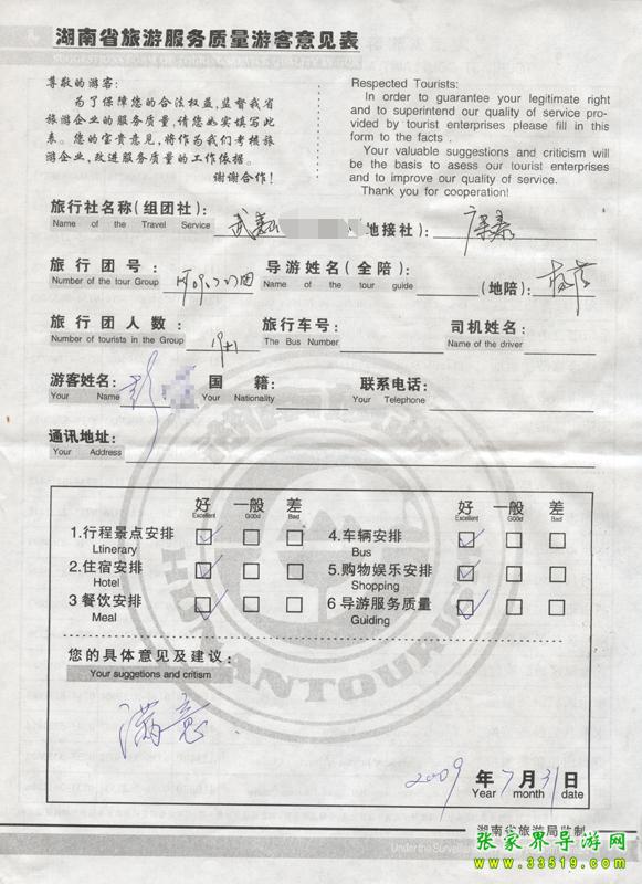 2009年7月27日彭女士一行20人接待質(zhì)量反饋單: