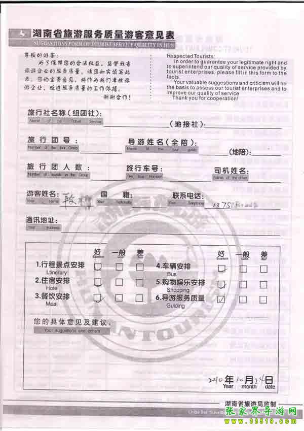 2010年10月5日段小姐旅游質(zhì)量反饋