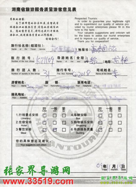 2009年11月9日馬來西亞yeap先生一行31人旅游接待質(zhì)量反饋單: