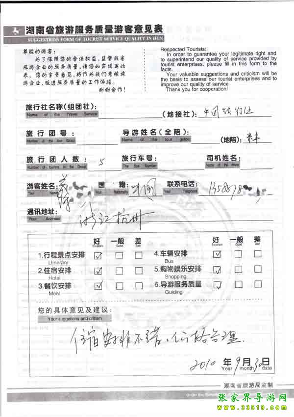 2010年9月30日菜小姐一行5位旅游質(zhì)量反饋:住宿安排不錯,價(jià)格合理