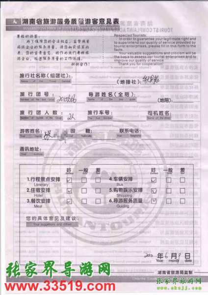 2010年6月9日張先生一行2位旅游質(zhì)量反饋