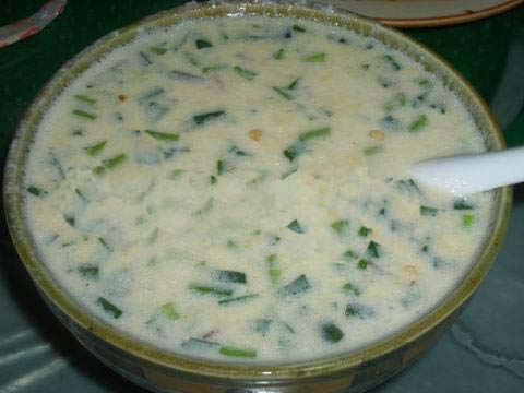 將用水浸泡過的黃豆用磨子磨碎,摻入切細的青菜葉,然后用溫火煮熟即可。此樣菜雖做法簡單,但營養(yǎng)價值極高且味鮮美,為當(dāng)?shù)厝顺S玫囊坏啦恕?/p>
